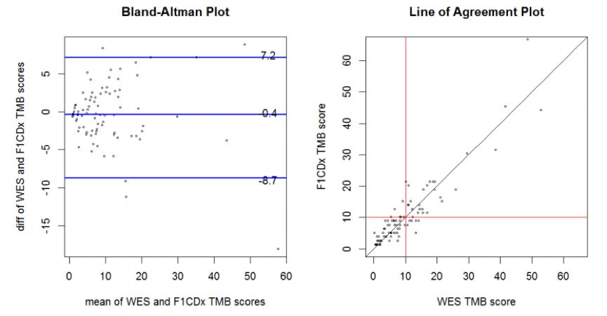 图2. F1CDx TMB评分与全外显子测序TMB评分的分析一致性