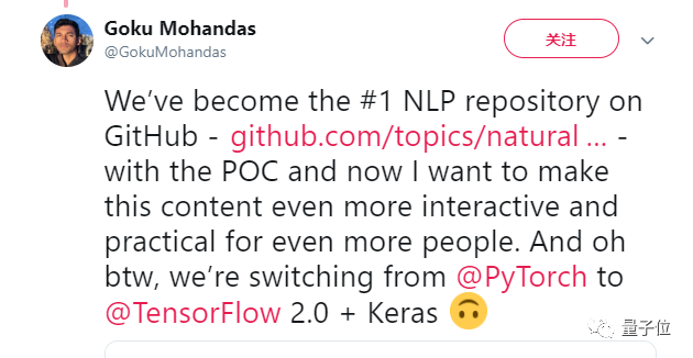 现在GitHub上排名第一的NLP机器学习课程practicalAI的作者、苹果公司AI研究员Goku Mohandas在推特上说,他们正在从PyTorch转向TensorFlow 2.0。