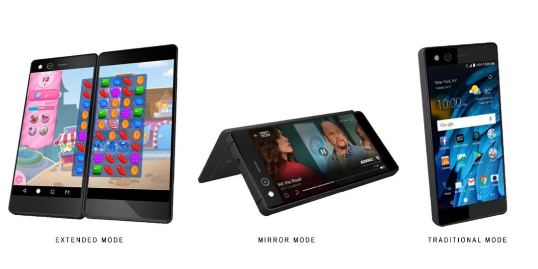 尽管 NEC 已经在外翻折双屏的道路上翻了一次车,但中兴还是义无反顾的在 2017 年 10 月 17 日发布了自家的双屏智能手机 Axon M。乍看之下 Axon M 和 N-05E 不能说是一模一样,至少也可以说是完全一致:在近乎相同的机身布局之下,Axon M 也就是将副屏进一步做薄了不少,至少在收起状态下达到了接近同时期常规智能手机形态的水准。除此之外,Axon M 几乎就是一台硬件配置更高、系统软件适配略好的 N-05E,虽然没有用上最新的骁龙 835,但好歹也有骁龙 821 加持,基础体验还是能够摸到及格线的。中兴 Axon M 与 NEC N-05E 的设计大同小异,毕竟外翻折双屏的设计已经很难再找到创新点了定位商务的 Axon M 自然是作为生产力工具而诞生的,并排双屏的设计在文字办公方面的确具有无可比拟的优势, 然而拥有两块屏幕的 Axon M 本身仍然属于小屏设备,其双屏作为生产力工具的上限受到了单侧屏幕尺寸的制约;再就是老生常谈的适配问题,中兴在国内的智能手机市场摸爬滚打了十几年,确实明白做好本地化的重要性,但中兴对定制 Android 系统的确没有什么心得,就算是近两年实装的 MyOS 也是个处处割裂的缝合怪,更别提在 2017 年了。最令人意想不到的是一些热门网络游戏对 Axon M 双屏的适配甚至比生产力软件要更优秀,因此性能够用的 Axon M 最终也未能避免成为游戏机的命运,从另一个角度看来也算是功德圆满,可喜可贺。