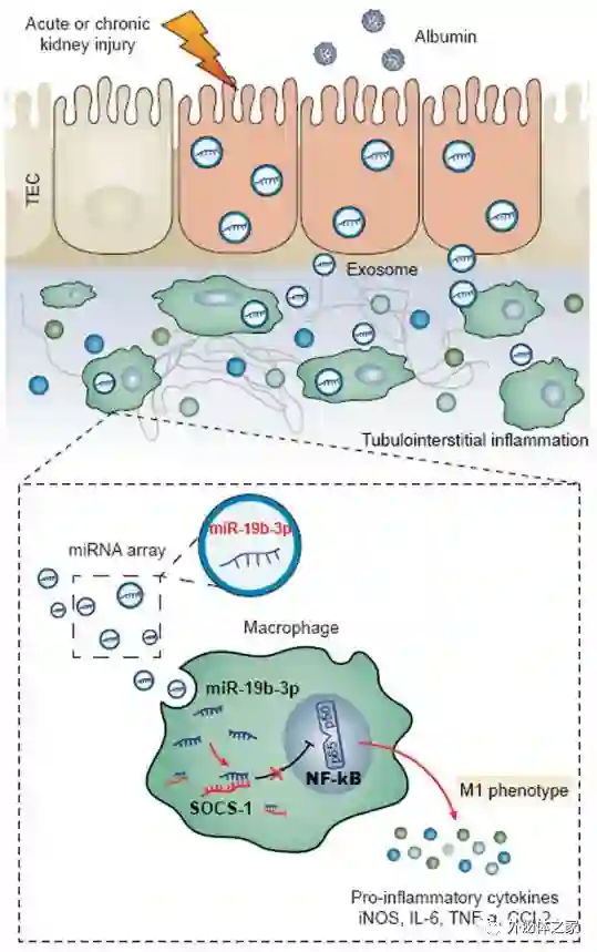 在这项研究中,研究人员探讨了TECs衍生的外泌体miRNA在肾小管间质炎症发生中的作用。在LPS诱导的急性肾损伤(AKI)小鼠模型中,研究人员检测了肾外泌体中的总microRNA表达谱,并且发现miR-19b-3p在TEC衍生的外泌体中是增加最显着的miRNA。在阿霉素(ADR)诱导的慢性蛋白尿肾病模型中也发现了类似的结果,其中也发现了外泌体miR-19b-3p的释放。TEC衍生的外泌体miR-19b-3p一旦被释放,就会被巨噬细胞内化,通过靶向NF-κB/ SOCS-1导致巨噬细胞的M1表型极化。双荧光素酶报告基因测定证实SOCS-1是miR-19b-3p的直接靶标。纯化后的TEC衍生的外泌体在小鼠中引起肾小管间质炎症,并且通过抑制miR-19b-3p可以逆转炎症的发生,证明外泌体miR-19b-3p在启动肾脏炎症中的致病作用。临床上,研究人员在尿外泌体中发现了高水平的miR-19b-3p,并且与糖尿病肾病患者的肾小管间质炎症的严重程度相关。因此,外泌体miR-19b-3p介导受损TECs和巨噬细胞之间的通讯,导致M1巨噬细胞活化。外泌体/ miR-19b-3p / SOCS1通路在肾小管间质炎症中起着重要的病理作用,可能会成为肾脏疾病的新治疗靶点。