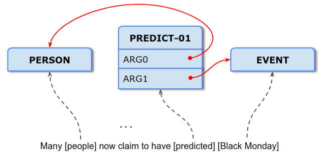 people是人物,Black Monday是事件,predicted是连接人物和事件的行为(其他概念),可单独作为一个框架元素PREDICT-01。当与人物发生相互作用时,PREDICT-01通过ARG0插槽表示“谁做的预测”,当与事件发生相互作用时,则用ARG1插槽表示“预测了什么”。整个判断过程基于语义概念结构,不会细化到针对每一个动词。