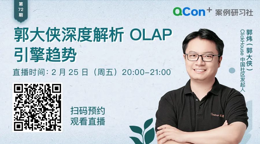 今晚 8 点,ClickHouse 中国社区发起人郭炜(郭大侠)将直播分享「郭大侠深度解析 OLAP 引擎趋势」,带你深入探讨三大 OLAP 引擎的现状和未来趋势。