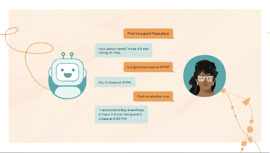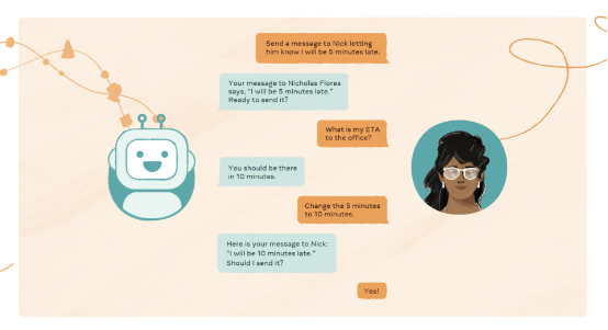 以上示例对话展示出我们希望新一代数字助手所应具备的关键技能:不仅可以提供准确、及时的真实信息,还能实现多模工作(跨视觉与语音)、跨域工作(发送消息并预估抵达时间),同时允许我们摆脱僵化的对话模板、自由主导对话的走向。