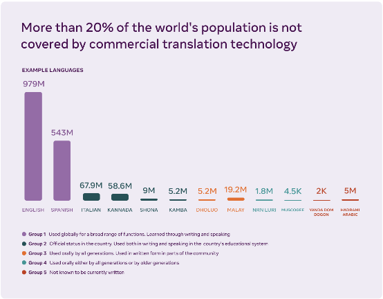 事实上,数据稀缺仍然是在翻译工具中拓展语言支持范围的最大障碍之一。文本翻译类机器翻译系统往往需要从数百万条带有注释的数据中学习语言模式,也正因为如此,能够进行高质量翻译的机器翻译系统只能支持在互联网上占主导地位的少数几种语言。要想扩展并支持其他语言,就意味着我们需要获取并使用小众语言那本就不多的训练示例。