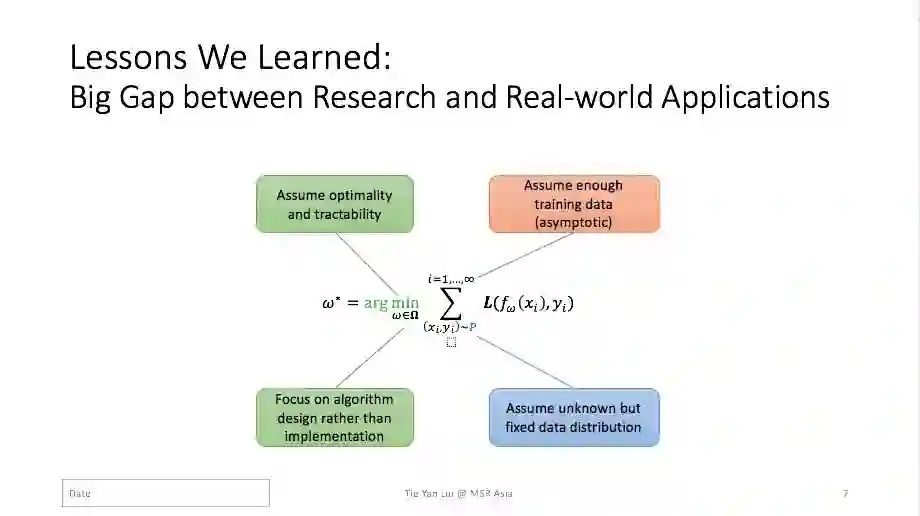 让我们通过这个小小的公式来展开今天的分享。它看似简单,却涵盖了一大类的机器学习问题。这个公式中x_i和y_i是从某一个分布P中采样得到的训练数据样本, ∑是对训练样本求和,L是损失函数,f_ω是需要训练的机器学习模型。机器学习的过程就是在训练数据上最小化损失函数,从而得到一个最优的模型ω*。其实这个过程中,蕴含了一些假设。比如:假设数据分布是事先给定且静态不变的,假设我们有足够的数据可以达到训练的渐进性能,以及假设我们不需要为实际应用中算法的部署和运算复杂度而担忧。然而,当用机器学习来解决真正的现实问题时,这些假设并不成立,我们将会面临很多新的挑战——包括来自数据规模和动态性的挑战,算法易处理性和最优性之间的平衡,以及算法效率和可扩展性的挑战等等。
