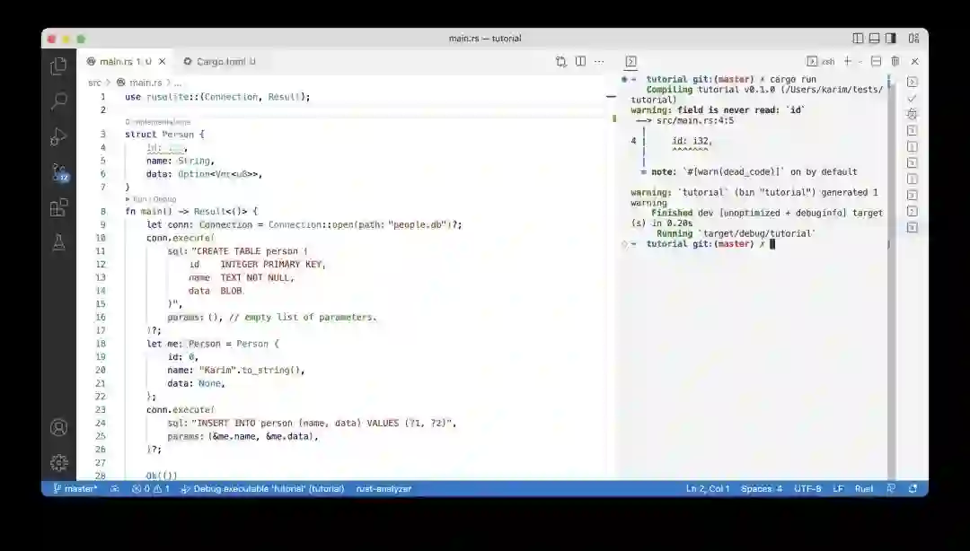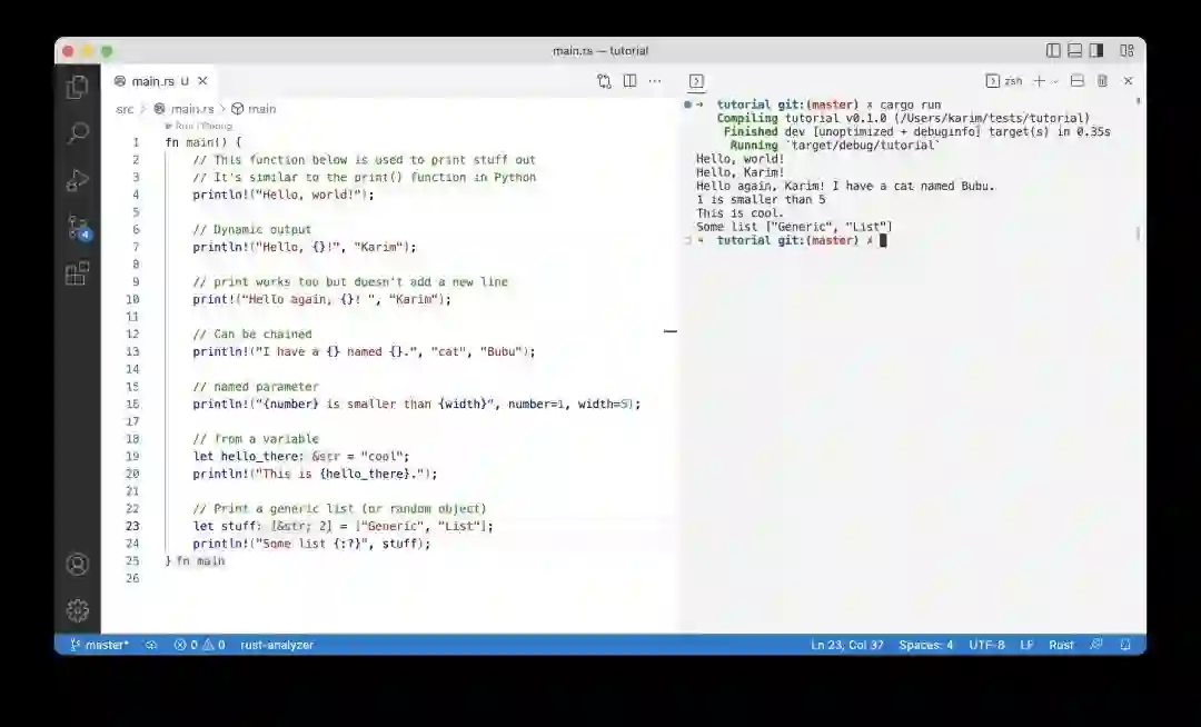 到这里为止,Rust 与 Python 其实都非常相似,只不过所有命令都是通过 cargo run 运行的,而不是调用特定文件,如 python3 somefile.py。
