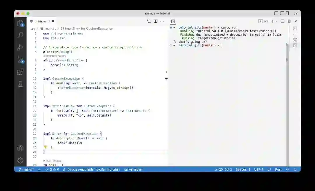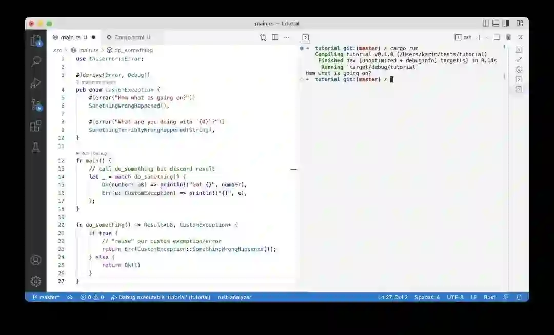 与其他行业相比,编程的最大优势就是可以使用别人构建的东西。如果你计划在程序中进行错误处理,那么有一个很好用的包 thiserror。Rust 的包管理器是 cargo。