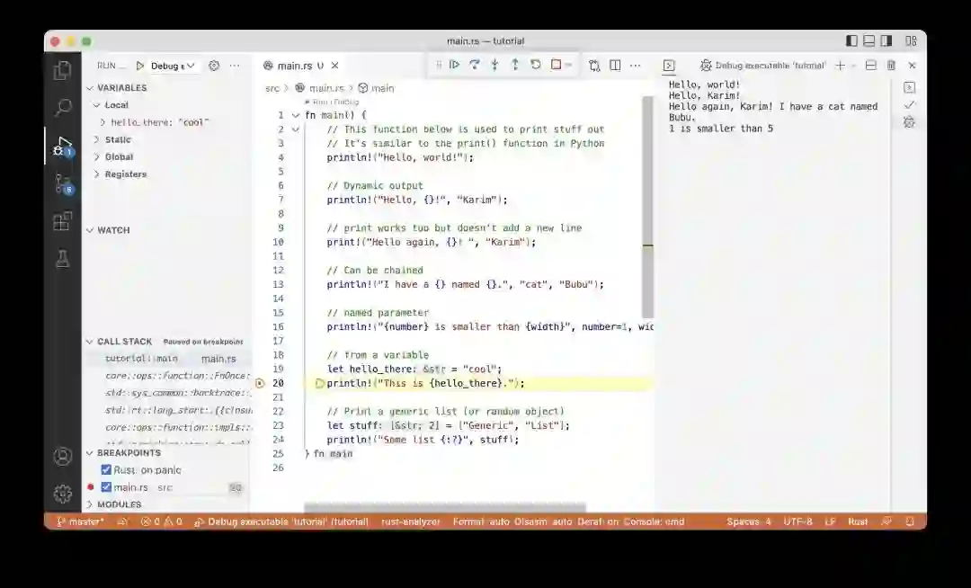 此外,你还可以使用常规调试器。在 M1 上,我推荐在 Visual Studio Code 中使用 LLDB,它不仅工作良好,通常还要比在输出结果中打印日志更为方便。