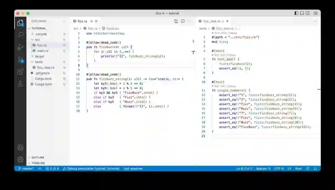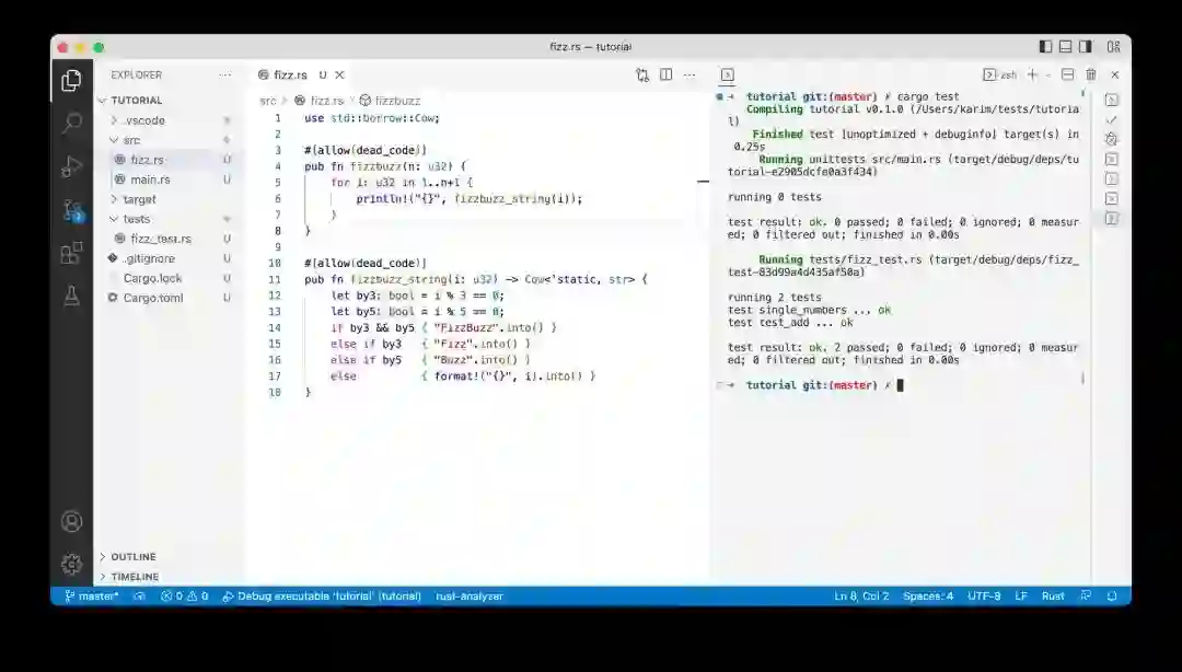 接下来,在文本编辑器中打开该文件夹。如果你是新手,我推荐 VSCode,因为其中的一些扩展很有帮助,关于如何使用这些扩展的指南也很容易入手。我推荐 rust-analyzer 作为 VSCode 的唯一扩展。