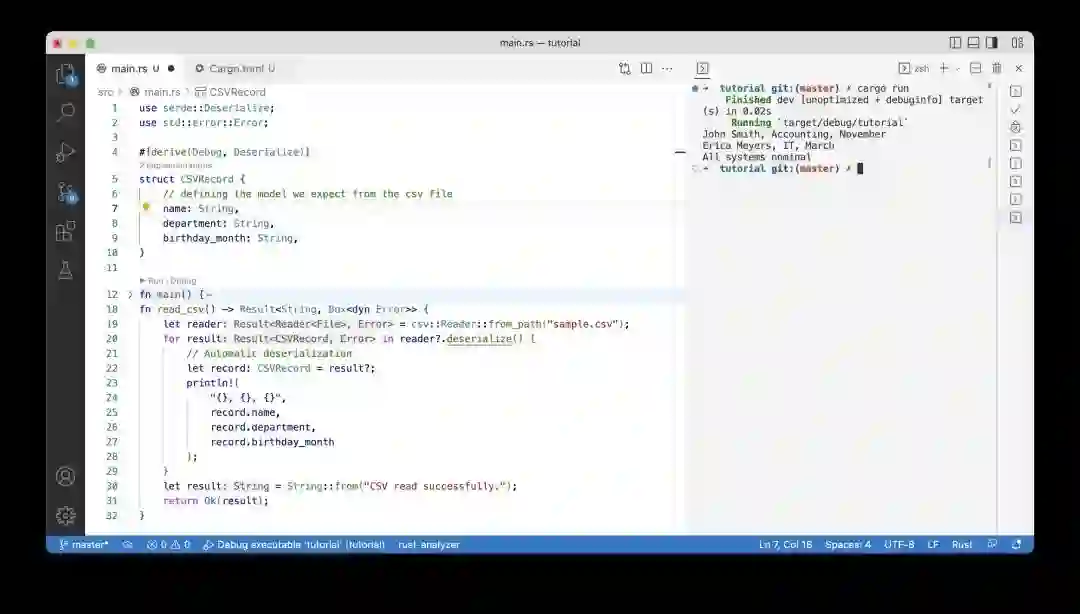 我认为,与 Python 相比,Rust的 CSV 处理能力不相上下,除了它能自动反序列化之外。