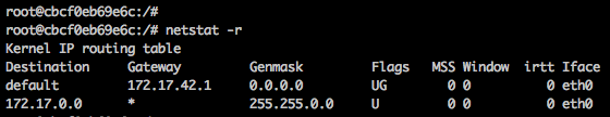 在宿主机上执行ifconfig,会看到docker0这个网络接口, 启动一个container,再次执行ifconfig, 会有一个类似veth****的interface,每个container的缺省路由是宿主机上docker0的ip,在container中执行netstat -r可以看到如下图所示内容: