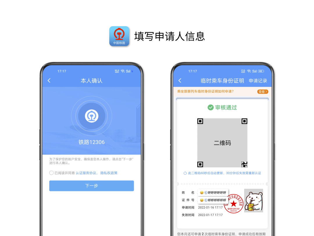 完成人脸核验、等待审核通过后,页面上会显示生成的临时身份证明,凭借二维码可完成入站安检、候车检票、列车上检票、出站的身份证核验,也可以在售退票窗口办理购票、退票与改签业务。