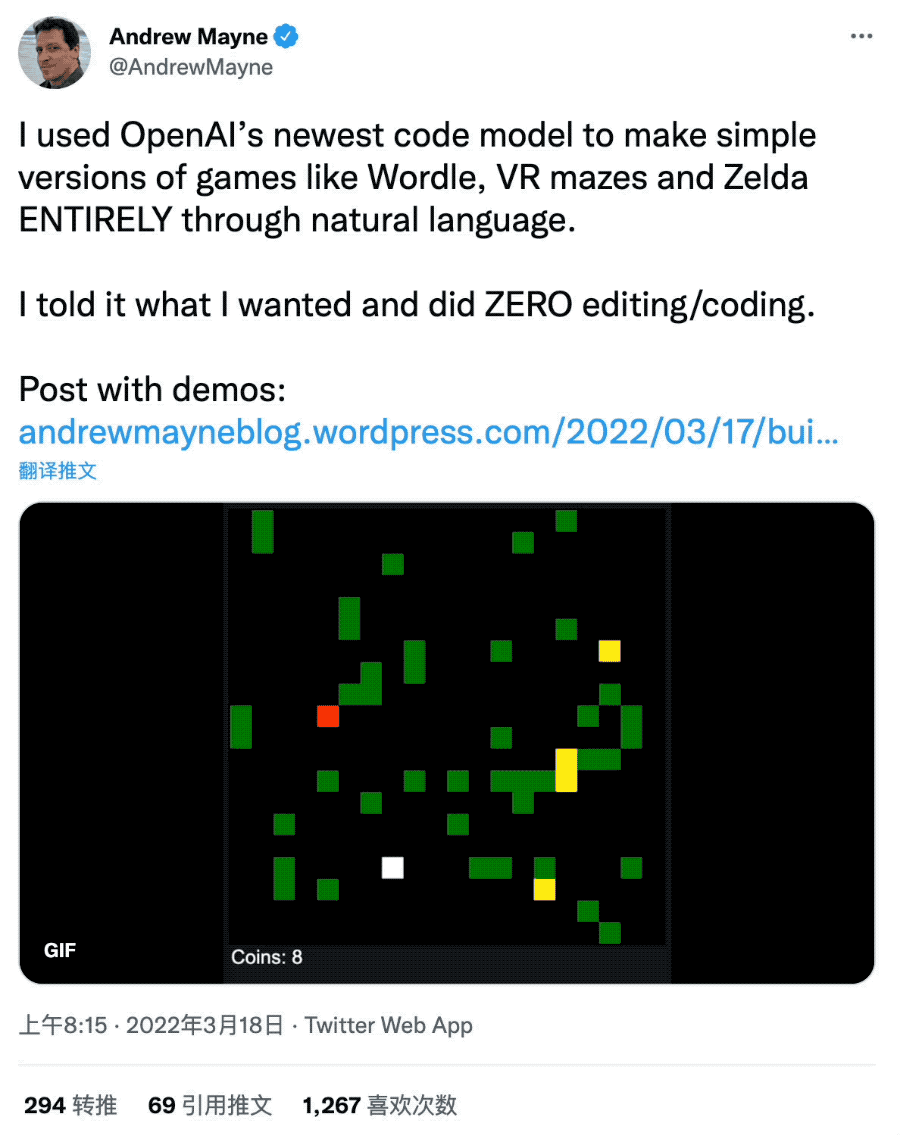 起初,Andrew Mayne只是好奇这版Codex的创造力极限在哪里,想做个实验,看看它能否根据文本直接生成小游戏。