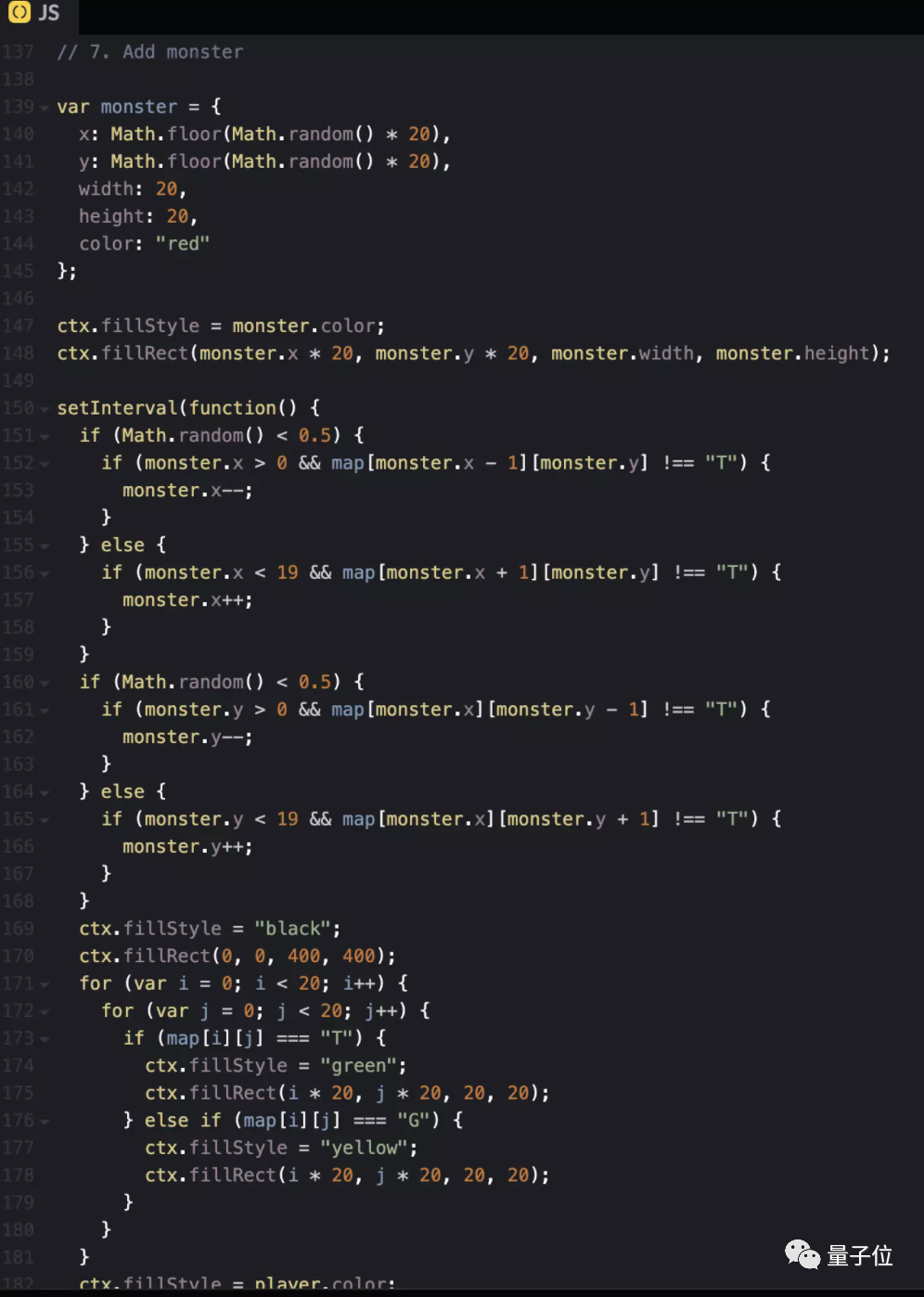 AI则根据上下文生生成了50多行完整的怪物生成、移动、判定分数的逻辑。