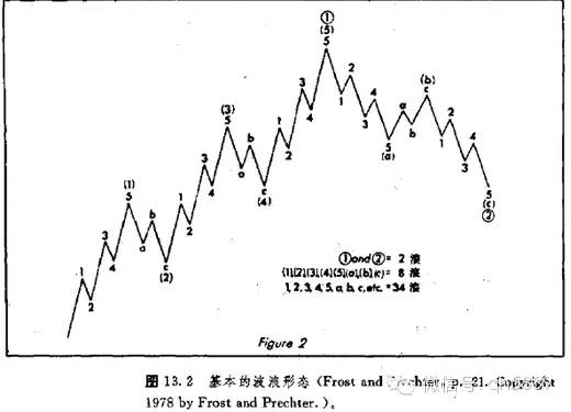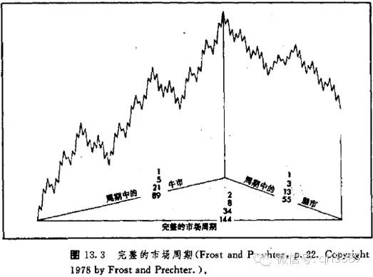 上面提到的数目——1,2,3,5,8,13,21,34,55,89,144——并不是偶然出现的。它们是菲波纳奇数列的一部分,而这个数列乃是艾略特波浪理论的数学基础。稍后,我们还要谈到这一点。现在,请朋友们从图13.1看到13.3,注意其中波浪的一个显著特征。到底应当把某一浪划分成五浪结构,还是划分成三浪结构,这取决于其上一层次波浪的方向。例如,在图13.2中,(1)浪、(3)浪和(5)浪被细分成五浪结构,这是因为由它们组成的上一层次的浪①是上升浪。而因为(2)浪和(4)浪的方向与这个大趋势相反,所以,它们只被细分为三浪结构。请仔细看调整浪(a)、(b)和(c),它们构成了上一层次的调整浪②。注意,其中两个下降浪——(a)和(c)——都被细分成五浪结构。这是因为它们的运动方向与上一层次的浪——②浪——的方向一致,相反地,(b)浪与其上一层次的②浪方向相反,因此被细分为三浪结构。