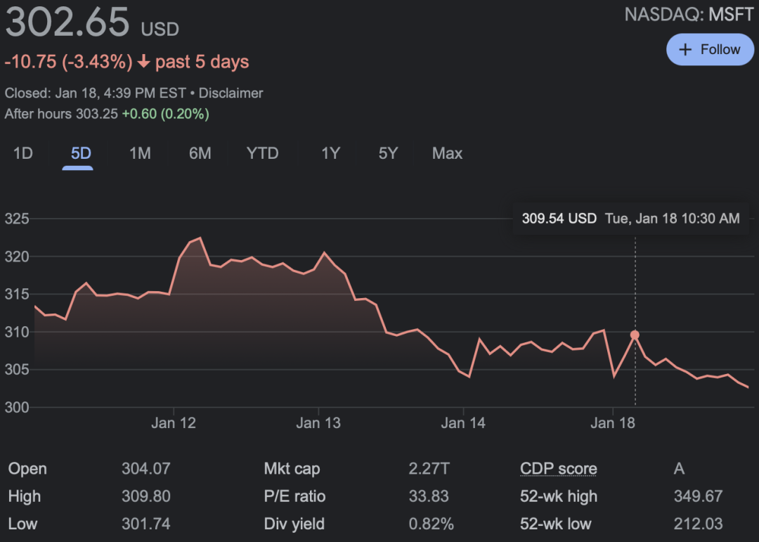 收购方微软股价昨日下跌2.43%,每股报302.65美元,盘后价格继续下跌。