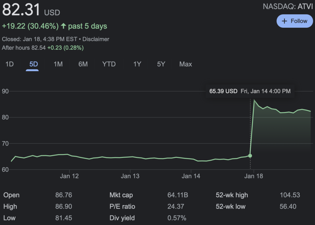 受收购消息影响,动视暴雪股价盘前一度大涨将近40%,目前收盘价较前一交易日上涨近26%,收于每股82.31美元。