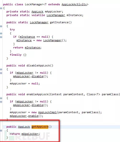 这个时候我们去搜索getAppLock,会发现getAppLock定义在 LockManager类中,作用是返回一个AppLock类的实例,到此我们已经就可以理清调用关系了