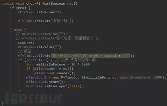 4、修改mainActivity,创建函数checkPinRes,如果密码正确则显示“密码正确”,如果密码错误则显示“输入错误,还可尝试n(n<5)次”,如果连续输错5次则需要等待10秒