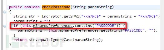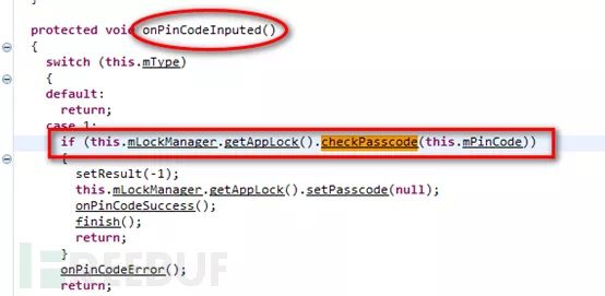 通过查找,我们发现有一个名叫onPinCodeInputed的函数(看名字就像是监听pin 码输入),代码中有一个if判断,关键代码this . mLockManager.getAppLock().checkPasscode(this.mPinCode)