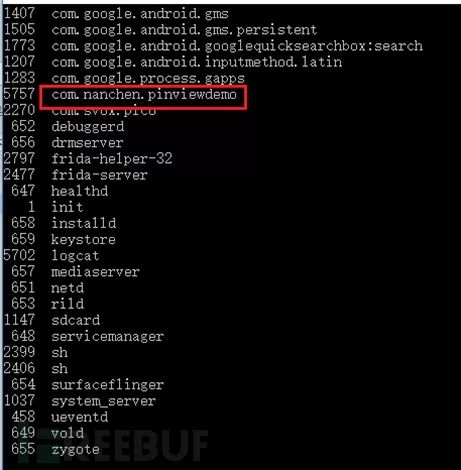 4、执行命令:frida-ps -R,如果出现android手机的进程列表说明搭建成功