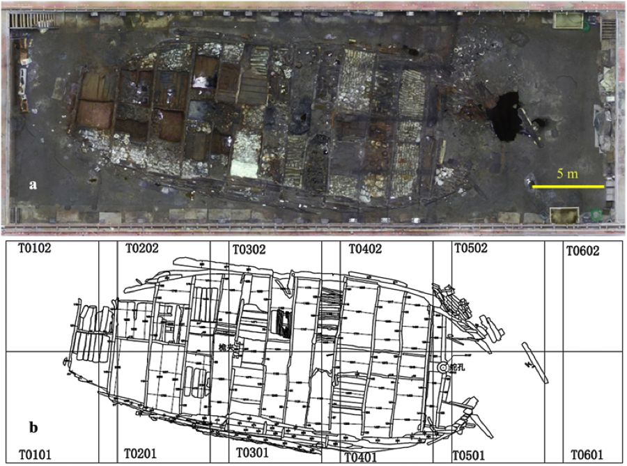 图.沉船考古发掘和船只残骸结构简图(以样方呈现)的俯视图