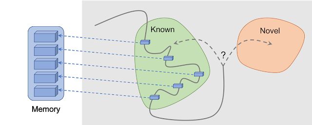 但是如何确定智能体看到的场景已经存在于记忆中呢?精确匹配是无意义的:在现实环境中,智能体很少两次看到同样的事物。例如,即使智能体返回同样的房间,它仍然会以不同于已有记忆的角度来看待这个房间。