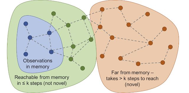 借助可达性(Reachability)的情景好奇心:将观测结果添加到记忆中,根据当前观测结果与记忆中最相似的情景之间的差距来计算奖励。当智能体当前看到的情景尚未出现在记忆中时,它会得到更多奖励。