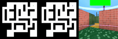 奖励可视化:红色表示消极奖励,绿色表示积极奖励。从左到右依次是:标有奖励的地图,标有记忆中位置的地图,第一人称视角