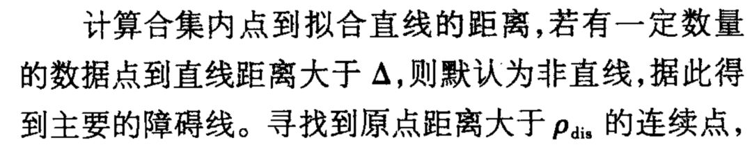 计算合集内点到拟合直线的距离,若有一定数量的数据点到直线距离大于 Δ,则默认为非直线,据此得到主要的障碍线。寻找到原点距离大于 ρ_dis 的连续点,如果连续点的数量大于定值,则默认为寻找到一个出口。
