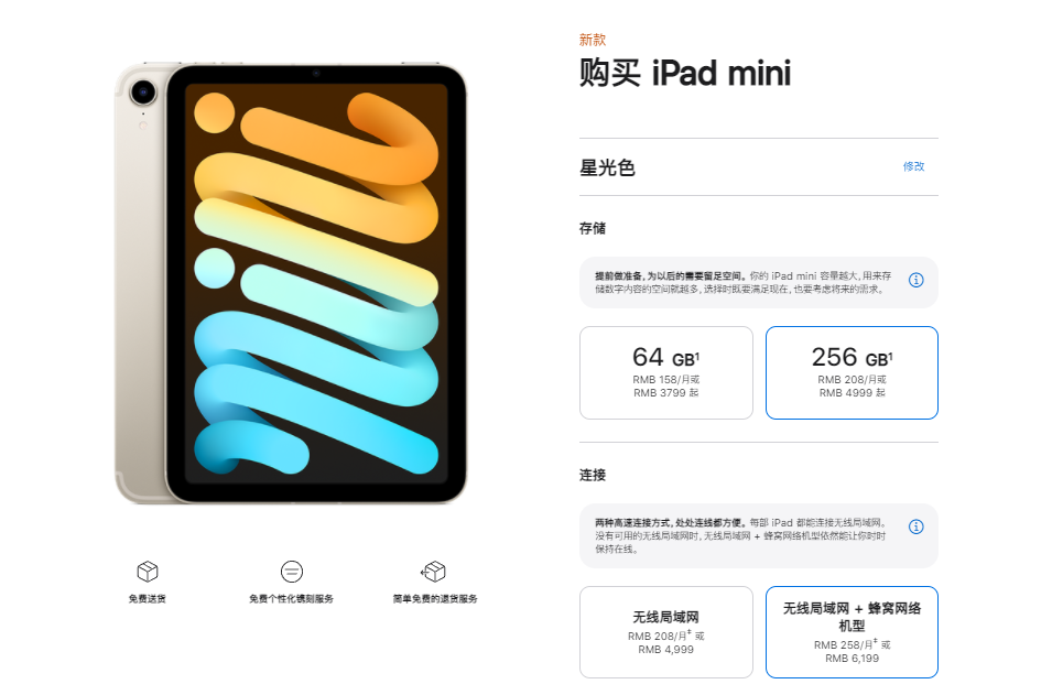 据网友今日爆料,iPad mini 6 WiFi+5G 蜂窝网络版现已在苹果中国官方在线商店上架,64GB 和 256GB 两个版本都已开放购买。iPad mini 6 采用全屏幕设计,配备 A15 仿生芯片,支持 5G、人物居中等众多功能。64GB 存储版售价 4999 元;256GB 存储版售价 6199 元。苹果官网显示,iPad mini 6 WiFi+5G 蜂窝网络版购买后预计会在 4~5 周内发货。
