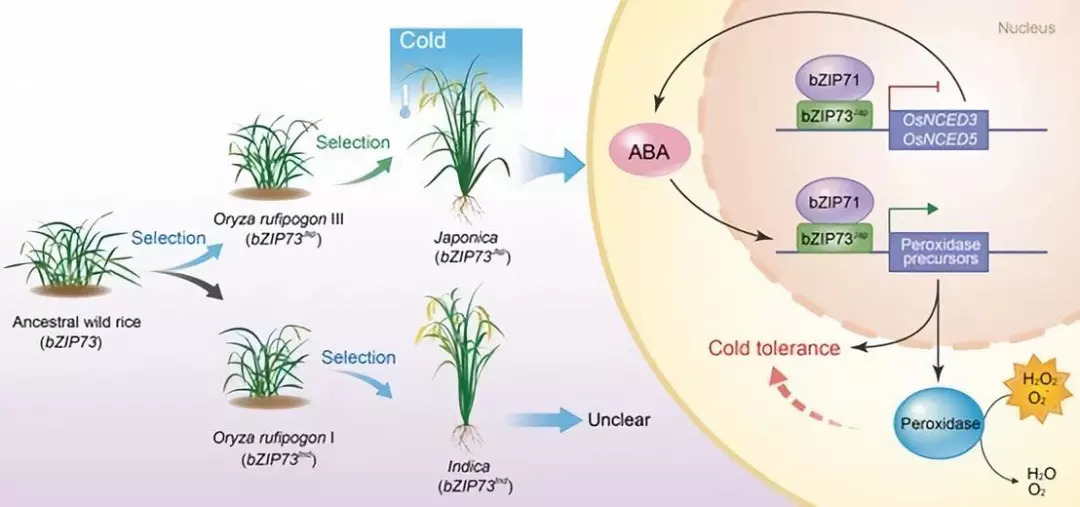 图1. OsbZIP73的逐步选择模式以及OsbZIP73耐低温的分子机制。