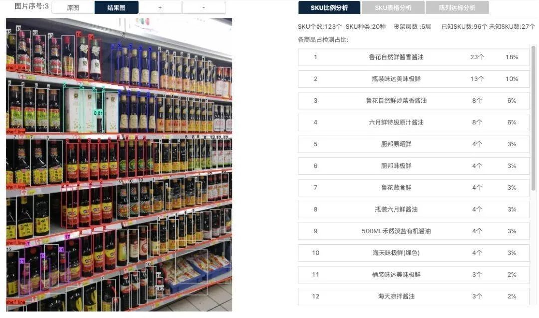 △ 后台识别结果,显示了货架 SKU 比例分析、是否陈列达标等信息