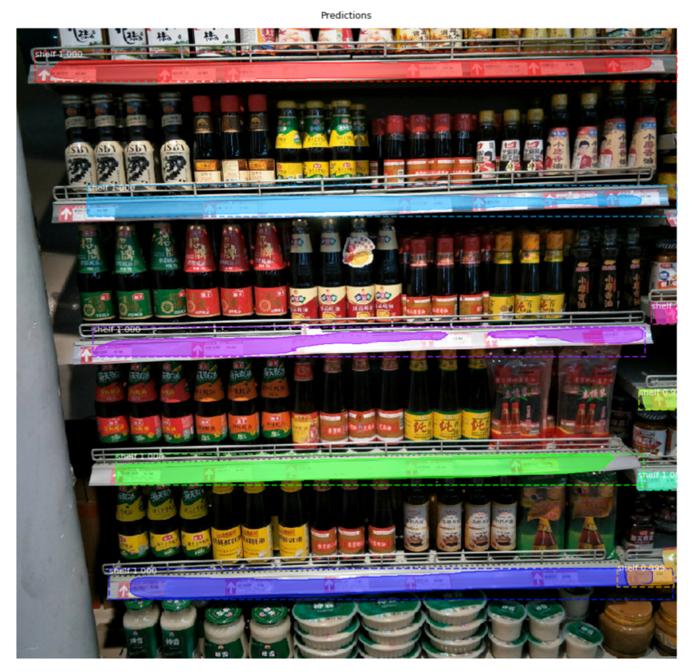 高质量完成商品识别的前提是拥有完美的数据,巡店员为了快速完成任务多数情况下一张照片拍上整个货架,导致在图片数据中货架倾斜严重,这对后续的商品检测识别十分不利,采用 TF 框架搭建的 Mask R-CNN 实例分割算法对图片中的货架层进行分割,