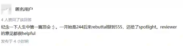 这位匿名用户也开启了“逆袭”之路,把244的打分经过rebuttal掰到555,另外,还给了spotlight。