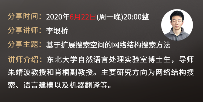 6月22日,东北大学自然语言处理实验室博士生李垠桥将带来主题为“基于扩展搜索空间的网络结构搜索方法”的分享,他在ACL、IJCAI等会议期刊发表论文若干,也曾多次参与 WMT、CWMT等机器翻译评测任务,主要研究方向为网络结构搜索、语言建模以及机器翻译等。