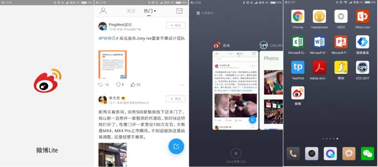 在桌面上点击刚生成的这个图标,会有独立的开屏页面——微博 lite,浏览页无论怎么上下滑动都没有了浏览器的地址栏,多任务切换也有单独的后台标签页。