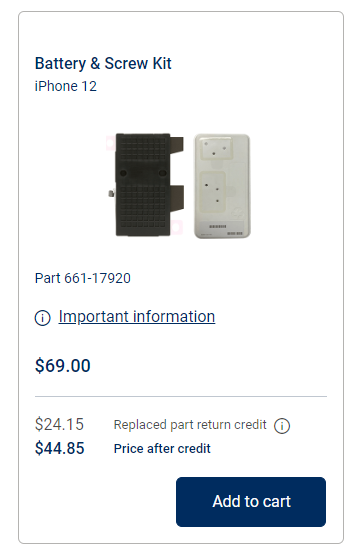 电池。iPhone 12/13 型号的电池和螺丝套件收费 69 美元,iPhone SE(第 3 代)的相同套件收费 49 美元——这与苹果官网所设定的保修期外电池更换的价格一模一样。