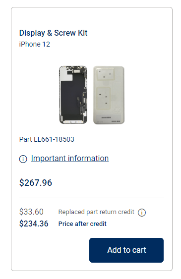屏幕。iPhone 12 原装屏幕和螺丝套件售价 267.96 美元,其在官网保修期外的维修费用为 279 美元;iPhone 12 Mini 屏幕的自助维修零件价格为 225.96 美元,官网/线下维修价为 229 美元——屏幕更换上,自助维修的确会省一点,但也没省多少。
