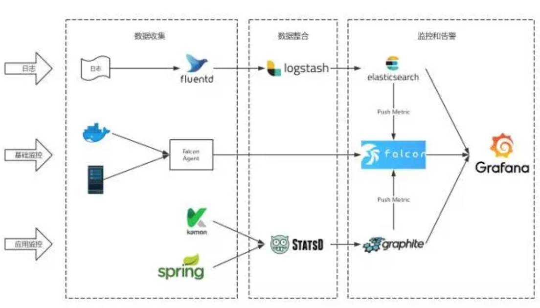 除了容器编排和 CI/CD,还有两个很基础的东西,一个是基于 ELK 的统一日志平台、另一个是基于 Open-Falcon、StatsD、Graphite、Grafana 的 监控告警平台。大致结构如下,具体实现以后有机会再专门写文章介绍,这里就不详述了。
