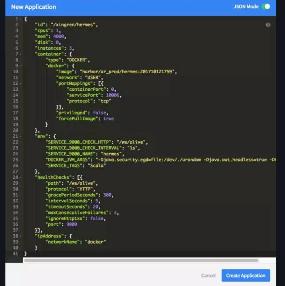 有了这套系统,我们创建应用、扩展应用就很简单了。创建应用时首先通过 Dockerfile 和 Jenkins 创建镜像,然后在 Marathon 界面上,只需要准备一个 Json 配置(也可以通过 Form 配置),指定资源、实例数、镜像、网络、健康检查、环境变量等,就可以很快上线一个新应用。