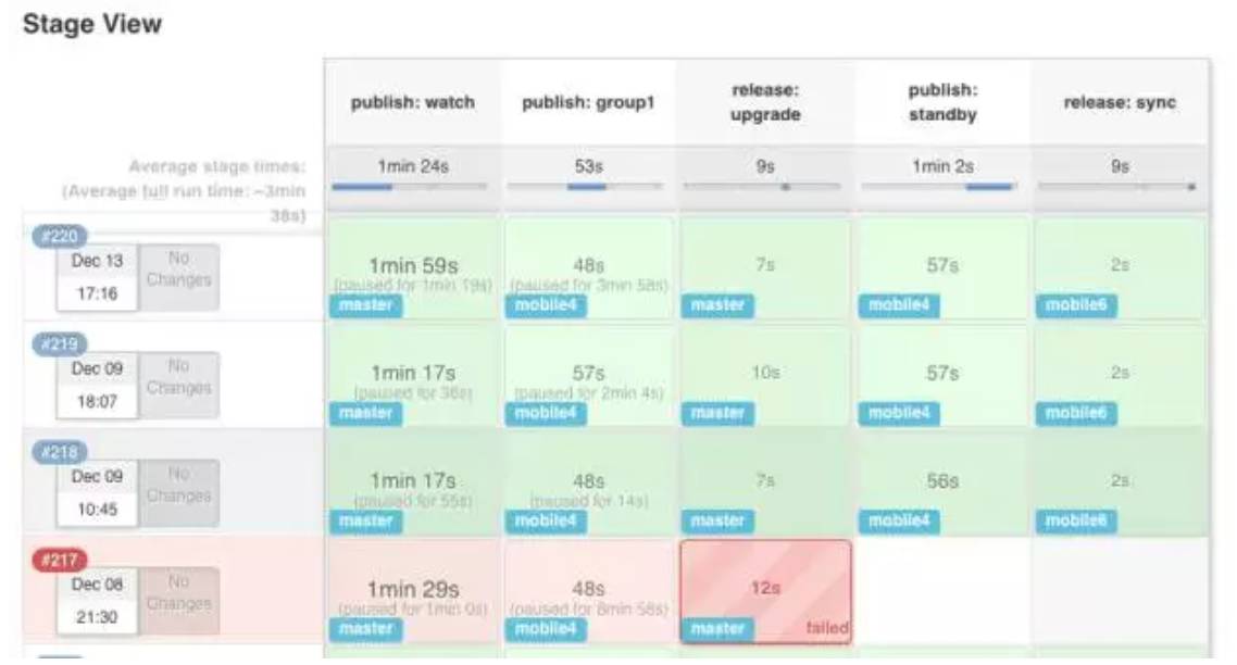 后来回头看,Frigate 虽然没有使用容器,但其实是实现了容器编排的很多功能。Frigate 发布的截图如下,这是基于 Jenkins Pipeline 的。