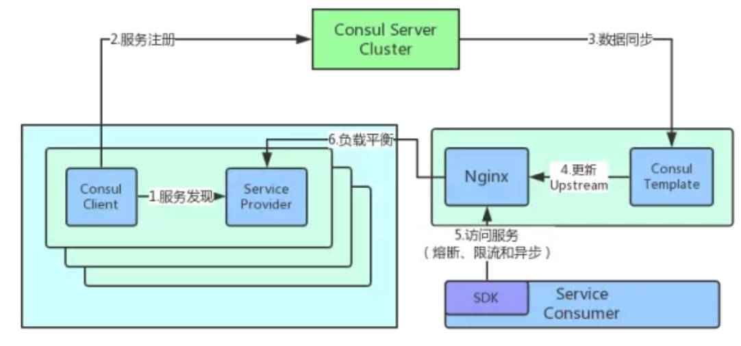 我们的服务注册和发现是基于 Consul 的,负载平衡是通过 Nginx 实现的。下图是整个服务注册和发现的过程: