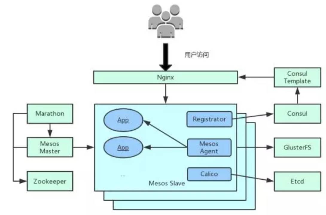 所有的应用都以容器的方式运行在 Mesos Slave 上,Mesos Master 统一管理 Mesos Slave 服务器。Marathon 通过 Mesos 调度容器,进行发布、升级、扩容等。Calico 是 Docker 的网络解决方案,实现了一个容器一个 IP 以及容器之间的互联。而右上角部分,我们基本保留了我们之前的微服务架构,只是用于服务发现和注册的 Consul Agent 替换成了 Registrator。