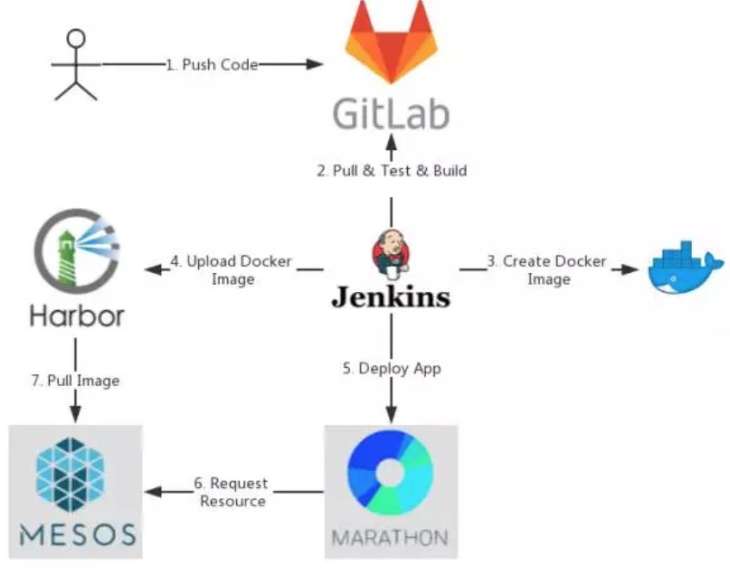 Jenkins 自身现在也是基于容器的,会在 Mesos Slave 的容器里进行编译和打包。应用会被打包成的 Docker 镜像,上传到我们的镜像仓库 Harbor 里。部署时,Jenkins 调用 Marathon 的接口进行部署,Marathon 则从 Mesos 申请资源。部署时 Mesos 会从 Harbor 下载相应的应用镜像并根据配置运行。
