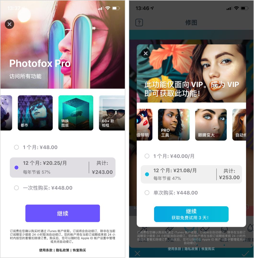 比如非会员购买1个月的Photofox Pro需要48元,而VIP用户购买1个月的Photofox Pro只需要花费40元。