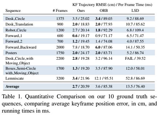 本文包含两个主要贡献。首先,作者用新的rank-1矩阵分解技术解决视觉里程计问题(经典的分解方法只针对正交变换或仿射变换的相机,作者的方法适用于透视变换的相机且无需知道投影变换中的深度信息),对于地图初始化造成的误差也更为鲁棒。其次,作者采用最新的全局SfM方法来处理Pose图最优化,得到多阶段的线性模型,同时能使L1优化对错误的闭环检测结果更为鲁棒。结合这两种方法,使得提出的方法可以得到更鲁棒的重建效果,而且速度明显比目前最先进的SLAM方法快(4倍,见下表)。