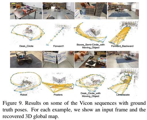 为了更好的研究比较,作者做了一个新的数据集(用Vicon设备记录相机的真实运动,部分图像序列见下图),并在上面将提出的方法与目前的流行方法进行比较测评,建立基准数据集。