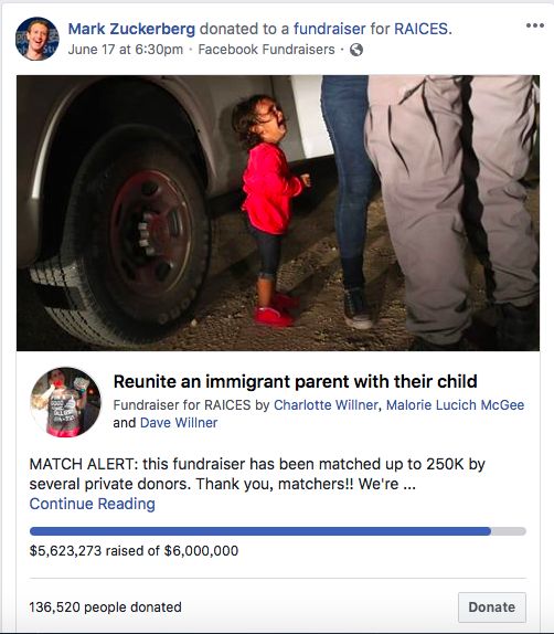 Facebook 的创始人扎克伯格响应了前员工的号召,给一个叫 RAICES 的法律机构捐款,这个机构希望捐款足以让每个离散家庭和无人陪伴儿童有律师代理。有数字说,小扎个人捐款数额是 6000 美元;COO 桑德伯格也捐了。不到四天,项目筹款超过480万美金,小探看的时候,已经突破560万美金了。