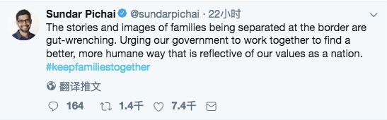谷歌CEO Sundar Pichai 发推特说:边界分离的家庭故事和图片,令人“痛不欲生”,我们的政府应该采取一种更人道、更好的方式来应对。甚至,他还用了#让家庭在一起的标签。